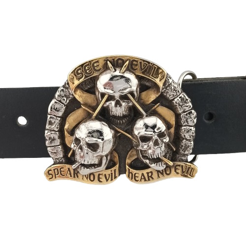 Gürtelschnalle Drei Totenköpfe, See No Evil, Zinnguss, nickelfrei, silber + schwarz + gold, für Gürtel bis 40 mm Breite